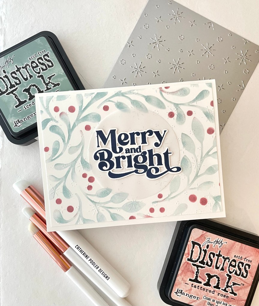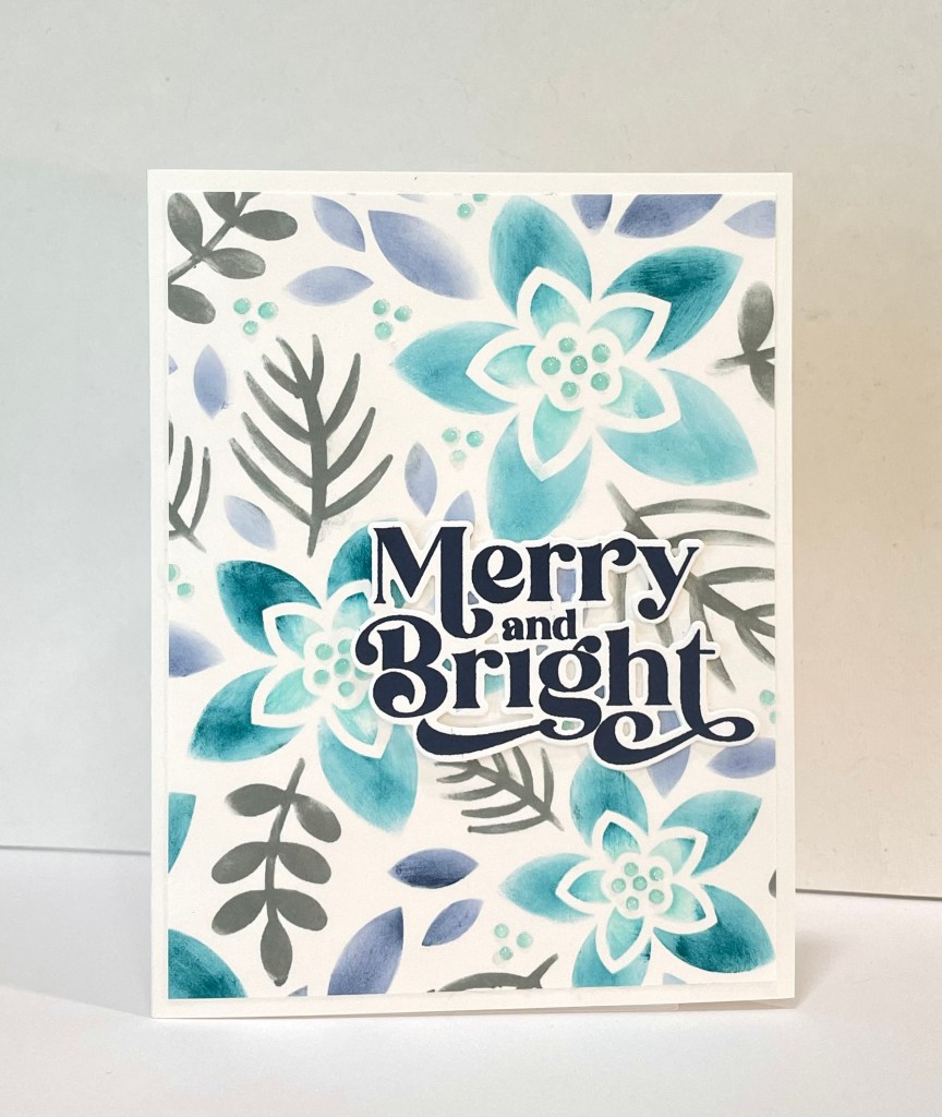 I also used two stencil backgrounds on a couple of the designs. One is Berries and Leaves by SSS and the other Winter Floral also from SSS. I experimented with both Distress inks and dye Inks with these stencils. I had fun playing with colors and using the chunky holiday sentiments from Making Spirits Bright set added to the ease of bringing the card together with minimal work. I did layer the sentiment with a couple extra pieces of die cut white cardstock to give it a little bit of ‘mailable’ dimension.