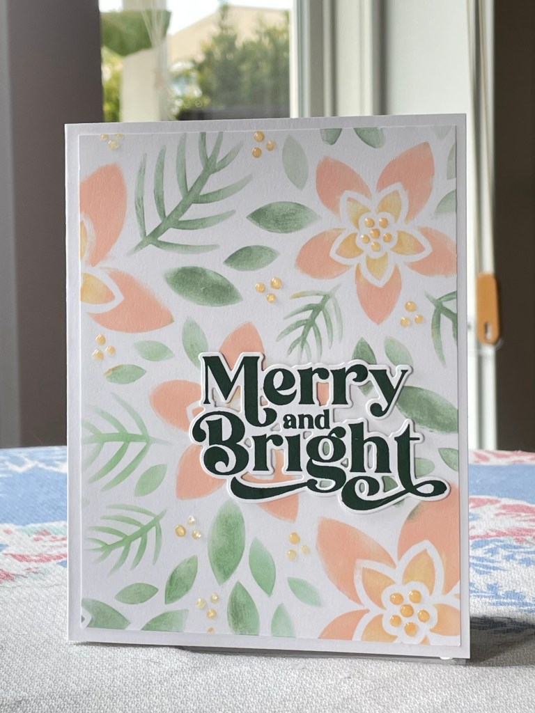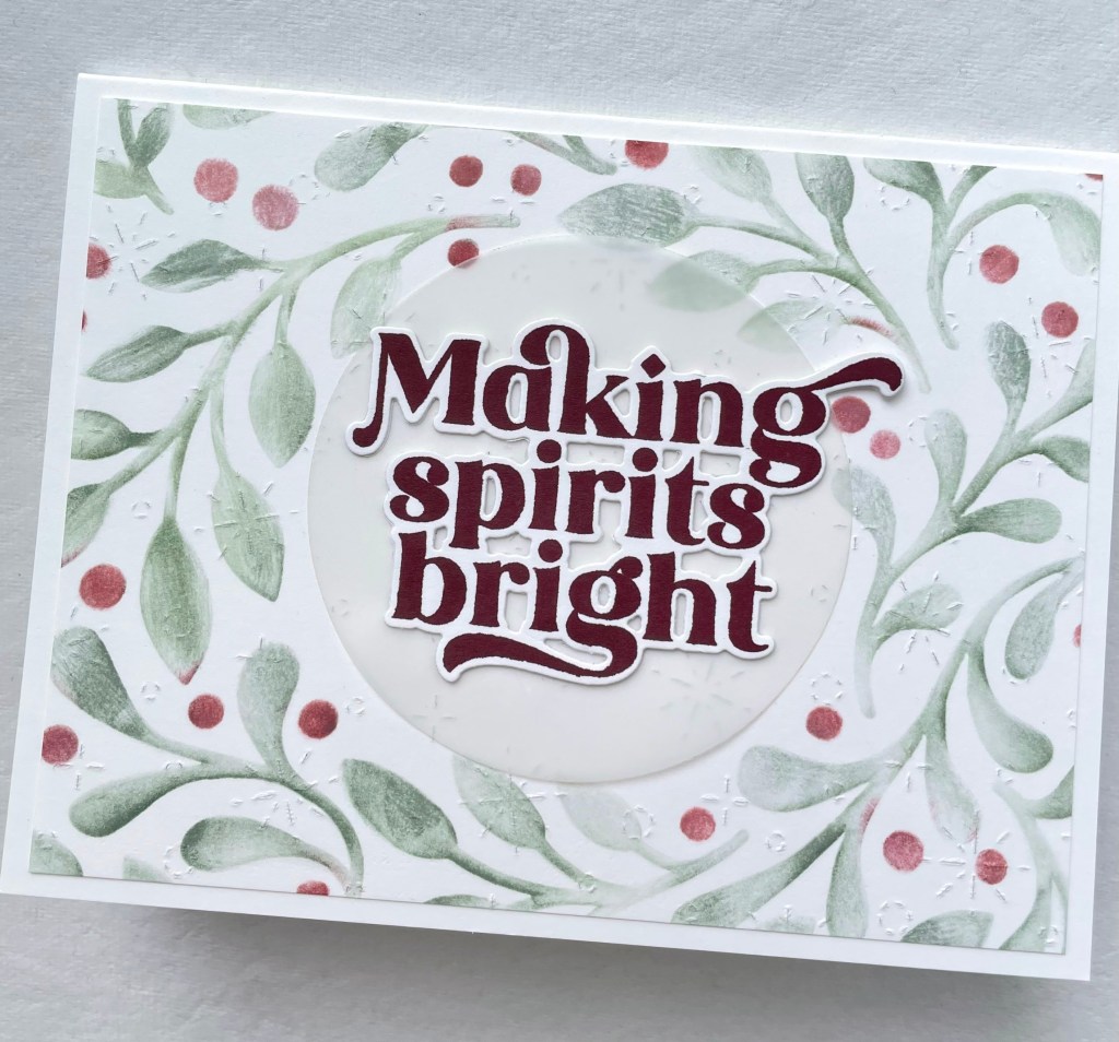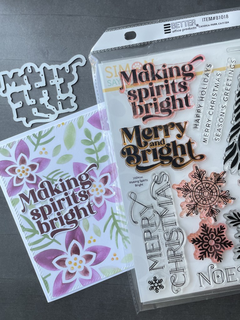This year I bought a new stamp and die set from Simon Says Stamp (SSS). Released in 2023 this set is called Making Spirits Bright. I mostly used the chunky sentiments that have a stamp and outline die to match. I also used the very classy ‘Merry Christmas’ sentiment that I heat embossed in various colors on vellum. This idea and style come directly from Debby Hughes’ blog found here. She is incredibly talented and such an inspiration of mine in the card crafting world.