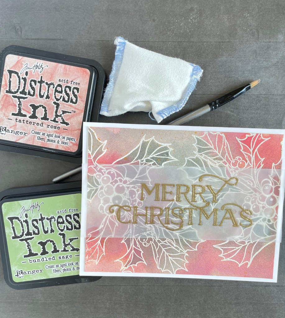 I used Ellen Hutson’s Mondo Holly by Julie Ebersole for my heat embossed stamped image to water color around. I used hot pressed water color paper which tends to be a bit smoother to stamp upon and for my water color I used Ranger Distress Inks which I smashed gently onto my glass mat, added light water spritzing then mushed the stamped, embossed image though to pick up the colors. I did this several times letting the paper dry in between. I also used a watercolor paint brush to fill in more color in areas like the leaves of the holly with Iced Spruce in the top left photo.
