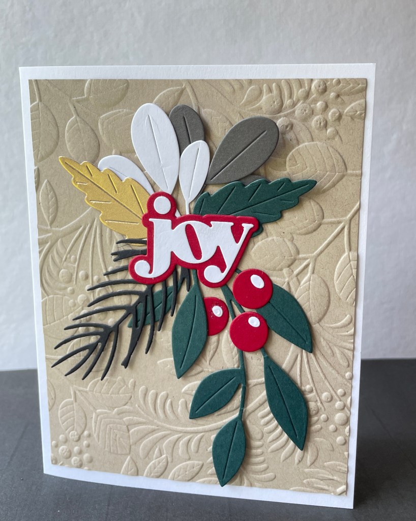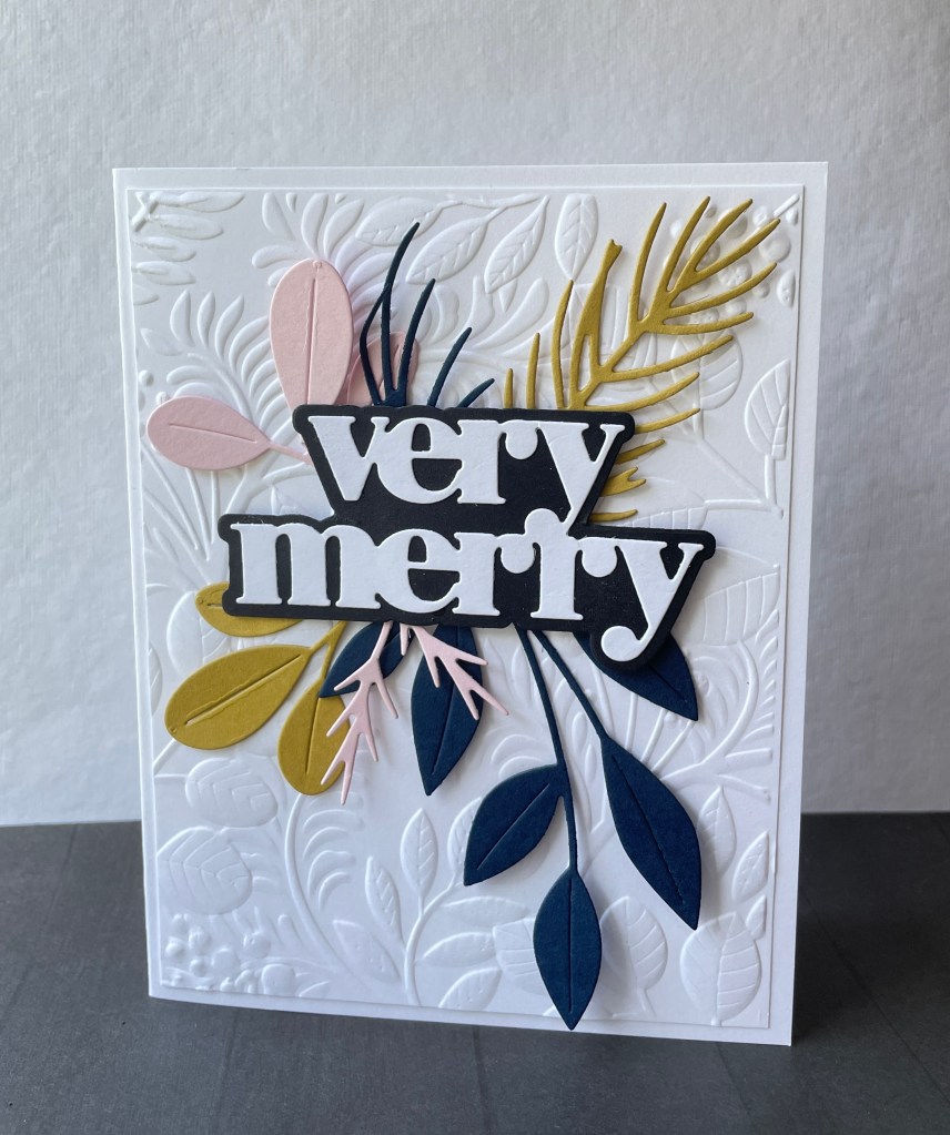 The sentiments are from C9’s Holiday Sayings Dies which include the following sentiments: Very Merry, Deck the Halls, Joy, Ho Ho Ho and Peace. After cutting, arranging and gluing all of the sprigs I decided to stop there and not add any additional embellishments or shiny bling. I like to think of these cards as being more sophisticated in style than the watercolors.