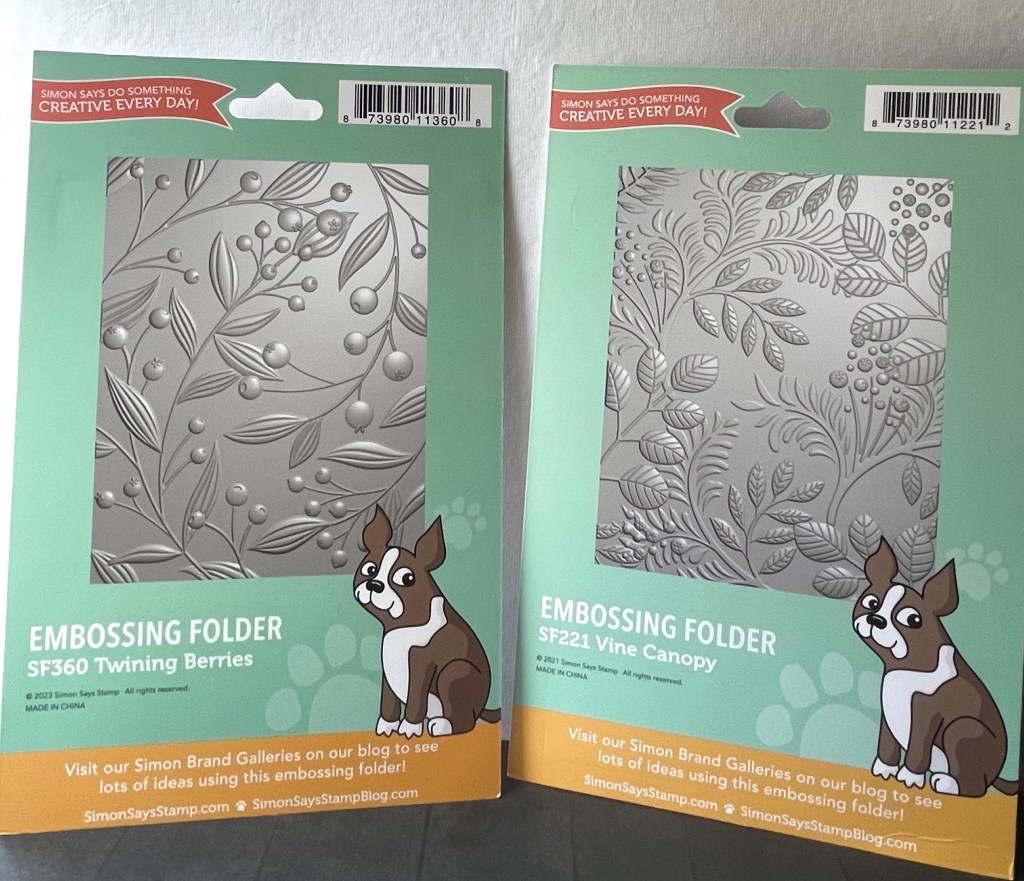 Primarily I used embossing folders for my backgrounds. Stayed with a white embossed base and my two favorite folders for this holiday card are Vine Canopy and Twining Berries both from Simon Says Stamp. These embossing folders are the 3D type and are thicker so I had to use the Platinum 6 die machine from Spellbinders to run them through.