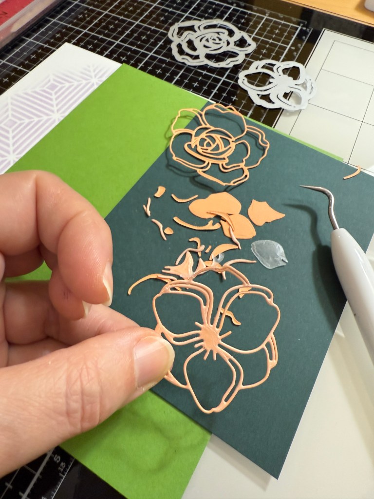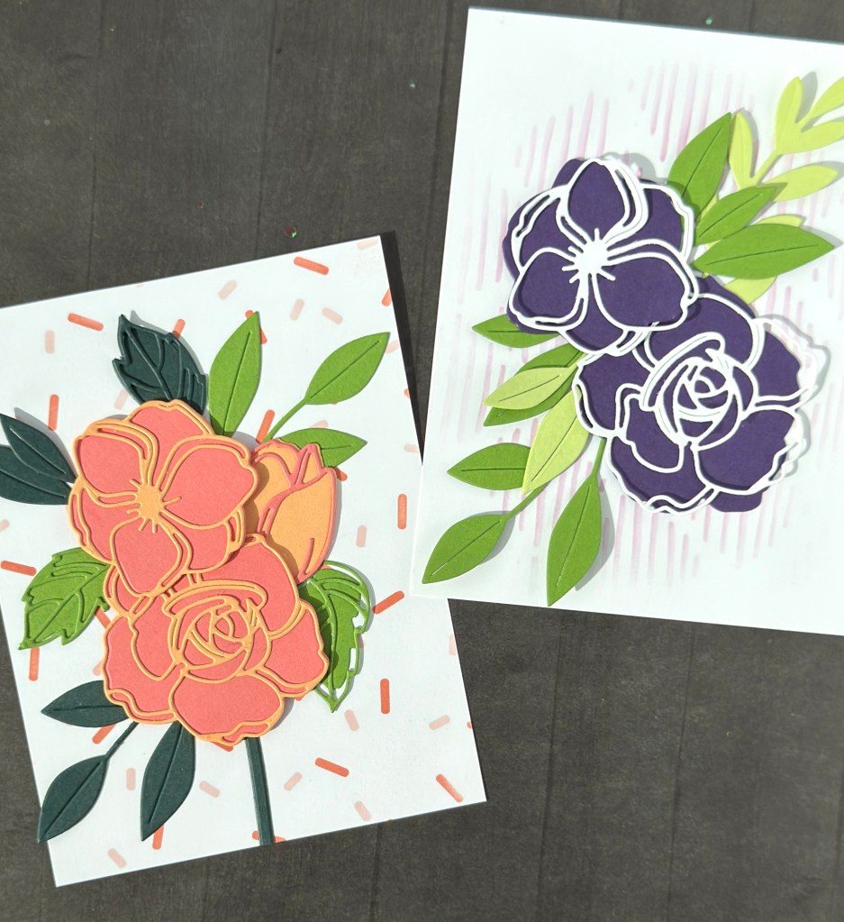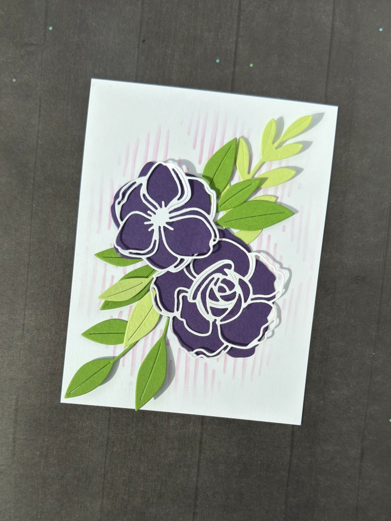 I didn’t use all of the colors in this combo on one card so I went ahead and made another. This card has a Lilac background applied through the Sketched Lines Stencil from Altenew. My greenery is die cut from Parsley and Sprout cardstock using Christmas Sprigs die set. My flower backgrounds are cut from C9’s Eggplant cardstock. So now it looks like I’m reverting to more of the #2 Color Combo Card colors. I just don’t have Fig cardstock, which might also work well here. But I certainly didn’t miss it and simply love the bold, rich Eggplant in contrast with the white cardstock outlines. I really love how these turned out and I have more backgrounds and die cuts on the work table.