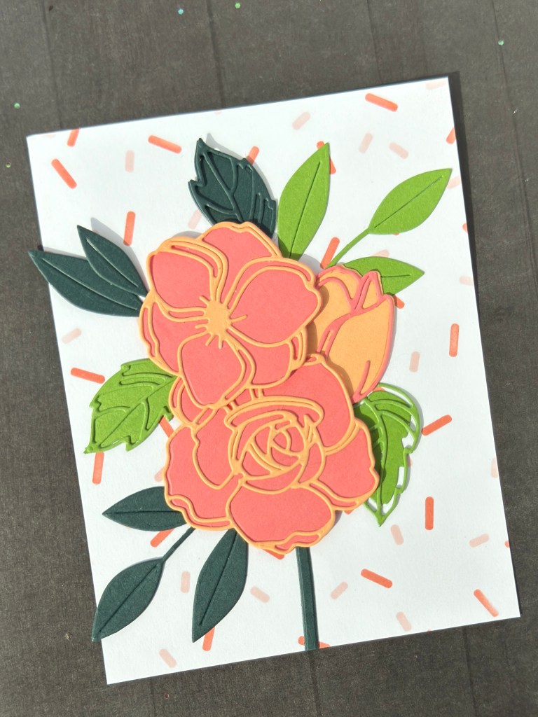 This card features Watermelon background florals with Creamsicle outlines and one tulip die (tucked under) in reverse. I used Parsley for some of the leaves from Floral Doodles and Rainforest for others. I also used leaves from Papertrey Ink’s die set, Into the Blooms: Christmas Sprigs (which, without it, I wouldn’t have half the cards that I’ve made this year 😉 ).