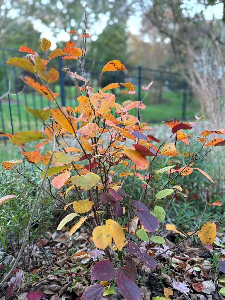 The bright orange is eye-catching but upon closer look there are leaves turning dark burgundy and leaves part yellow, orange and red, even emerging new green leaves. Its bold fall vibrancy almost seems unexpected as Fothergilla usually gets lost all summer with its small to medium size and ordinary green leaves. I find the woody little shrub remarkable because it’s as if it’s saying, “Here I am, you suckers! You forgot that I had it in me to burst such awesome colors! I won’t be counted out yet!”