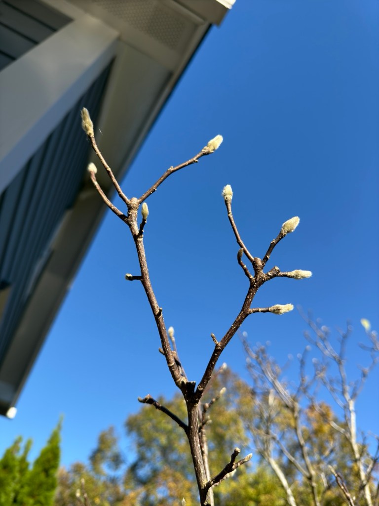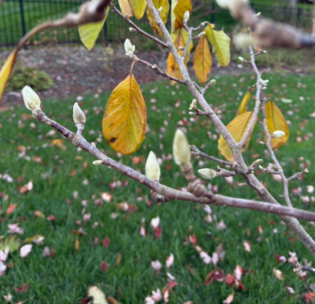 In our garden we have two deciduous non-native Magnolia species that we chose for their smaller statures and beautiful early spring blooms that emerge before the leaves. Ranging in color from white to pink to yellow, these blooms are hopeful in spring but long before the show of flowers and leaves, emerge their tough yet velvety little buds, popping out along the ends of bare branches in autumn.