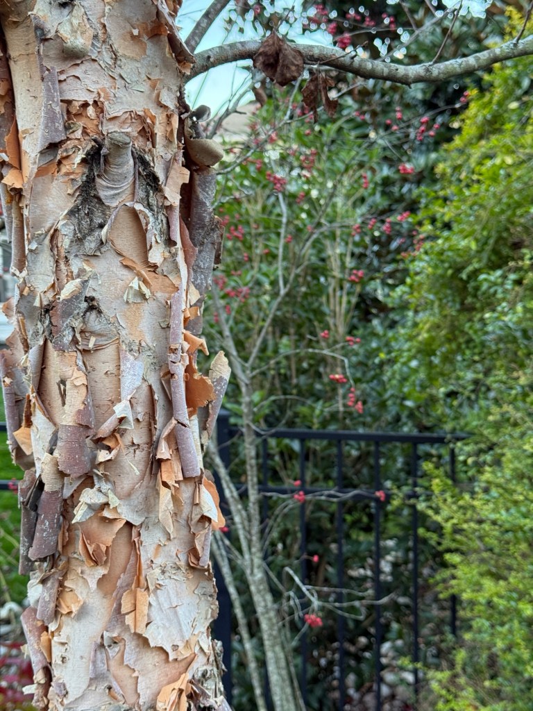 Betula nigra, another tree native to our area, commonly known as the river birch, does produce a pretty yellow changing leaf in fall, but to me that doesn’t nearly show off and draw interest as much as its unique exfoliating bark. Like papery shedding skin, the bark curls and unfurls in layer after layer revealing a smooth, pale inner bark. And yet not until fall, when all its leaves have finally left, do we begin to take more notice of this curious tree.