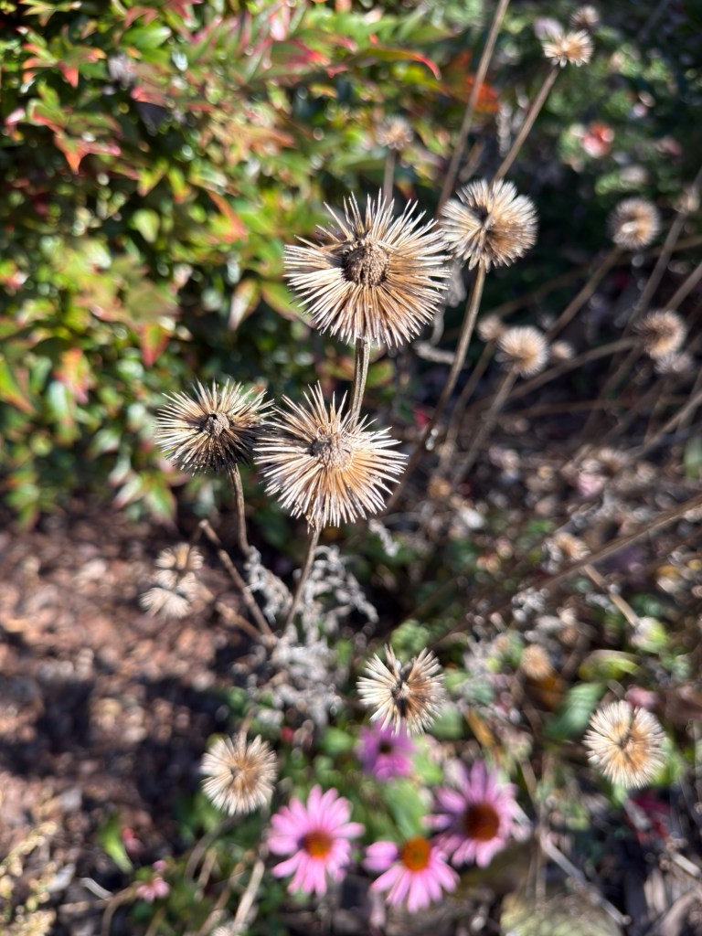 Many people may find the leafless stems and brown seed heads part of the messy aftermath of beautiful, blooming summer. They cut them down and clean them up. Sometimes there’s already new growth, if you’re in a zone like mine, Zone 8. For me the hope carries on in what the dormant plant still has to offer, when all the color has faded. Leave your stems through the winter and in spring cut back only slightly to allow for the activity of smaller bees who find the hollow stems a perfect place for nesting.