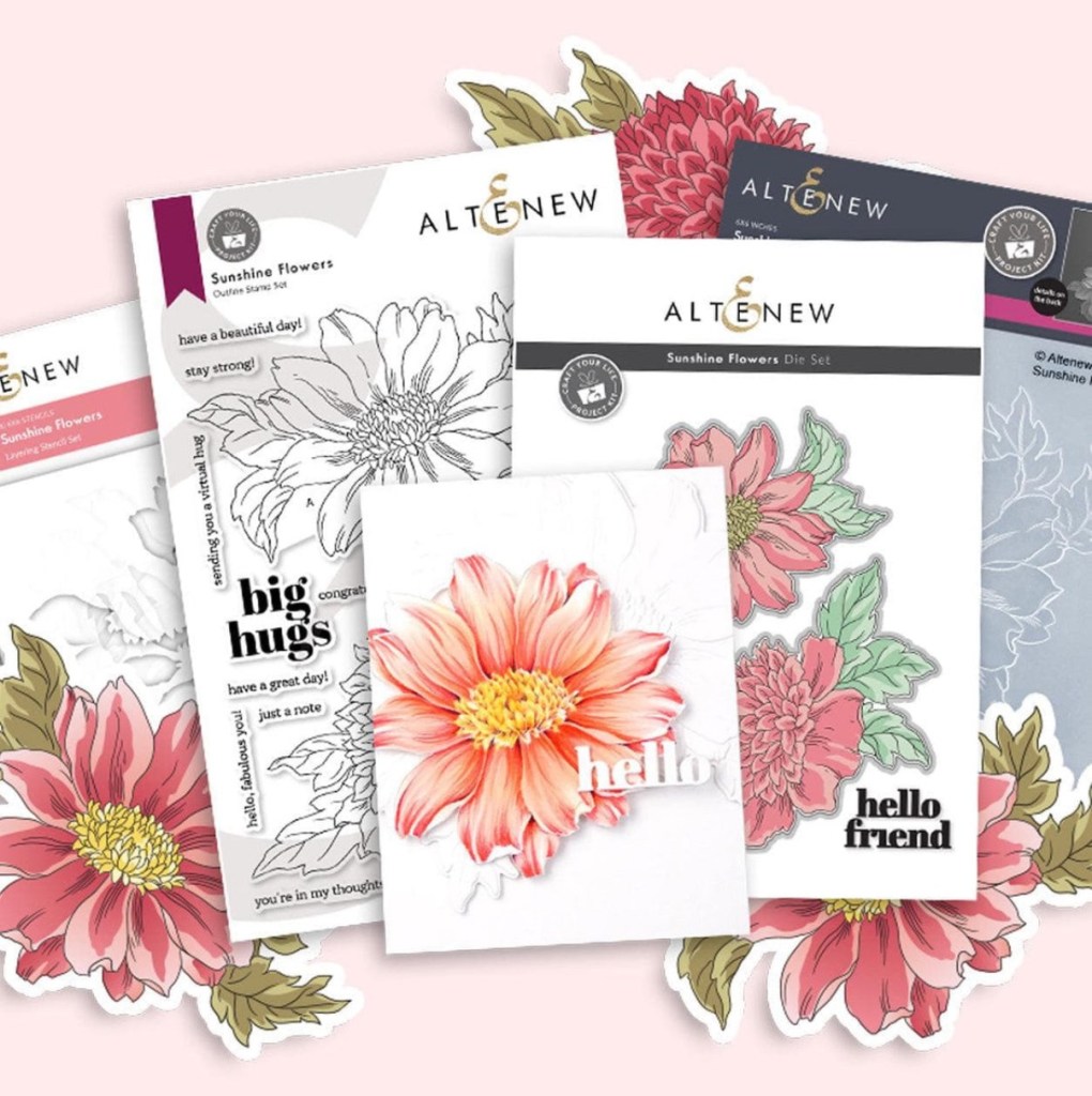 I decided to try some big flower designs using the color inspiration as a guide. This Sunshine Flowers kit from Altenew has all the goodies and parts, offering full versatility. The set includes the stamps, die cuts, stencils, embossing folder and project guide.