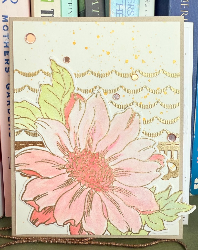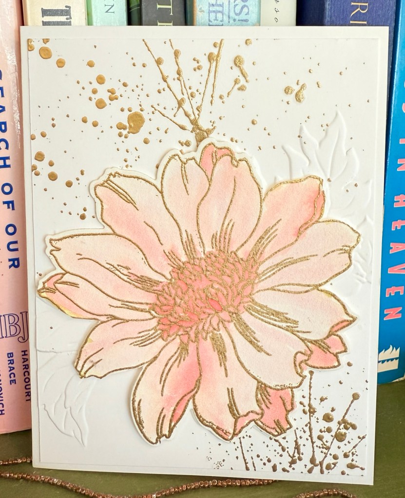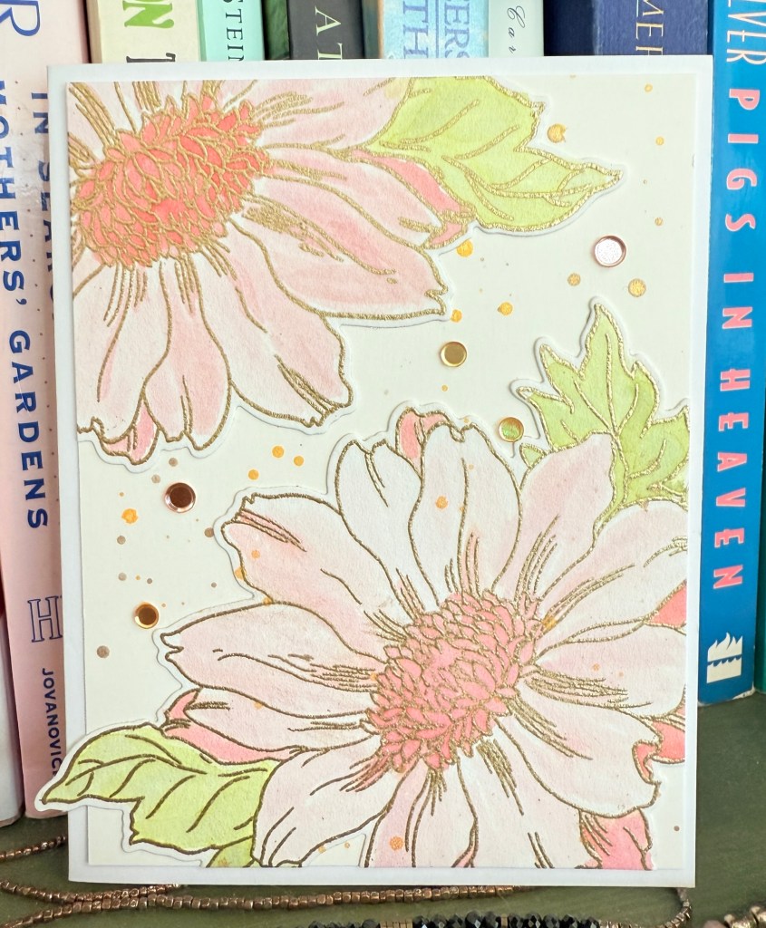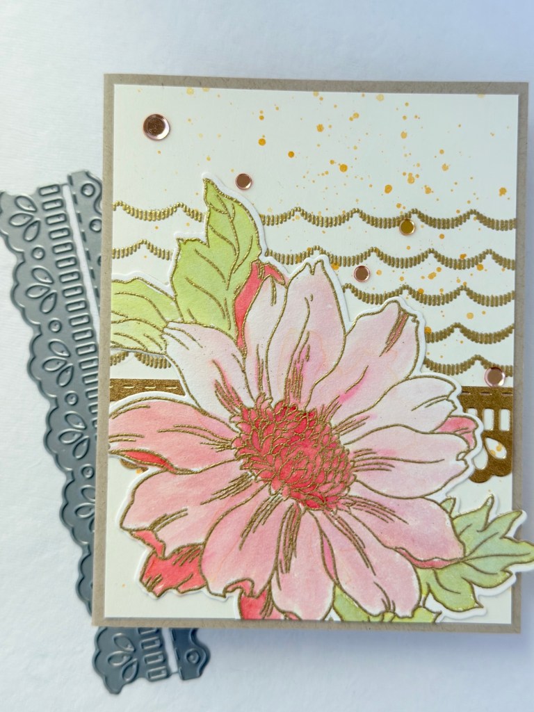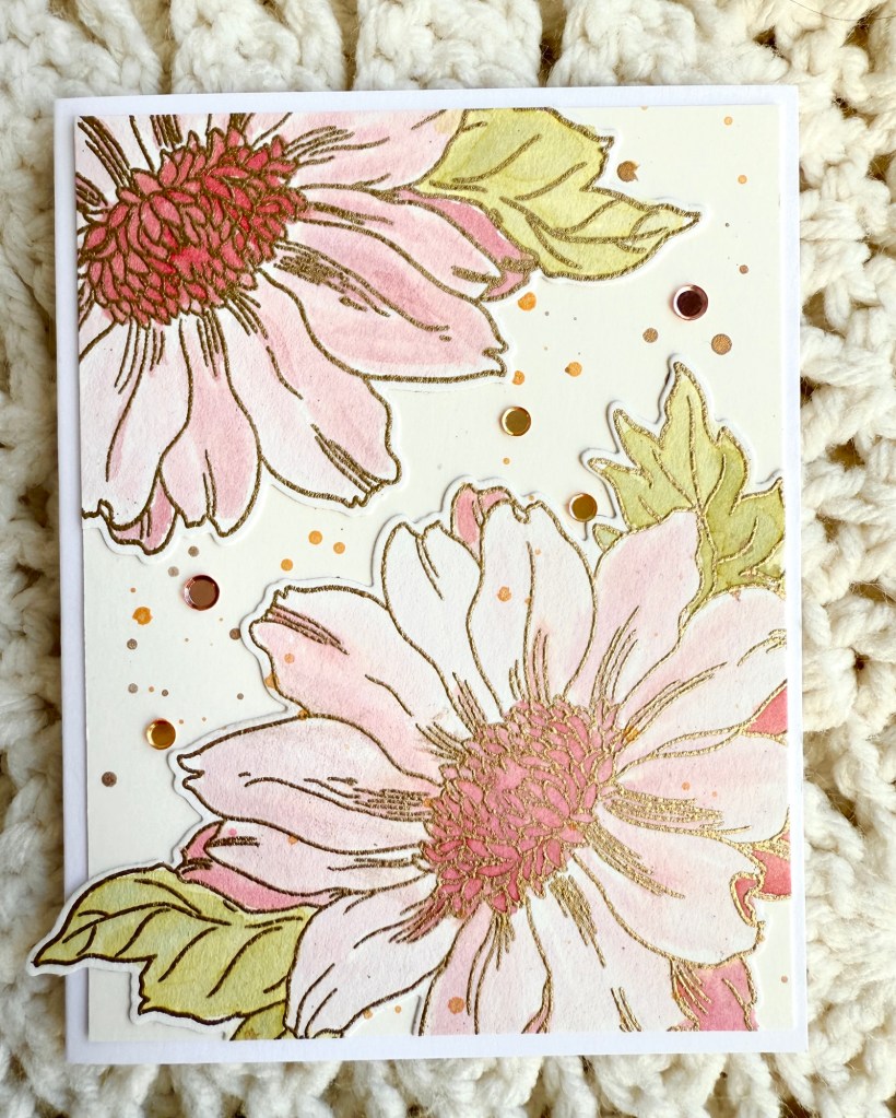 I die cut two flowers and affixed them onto an ivory card base. Then I added a little gold splatter and pink-ish Sequins to embellish the card above.