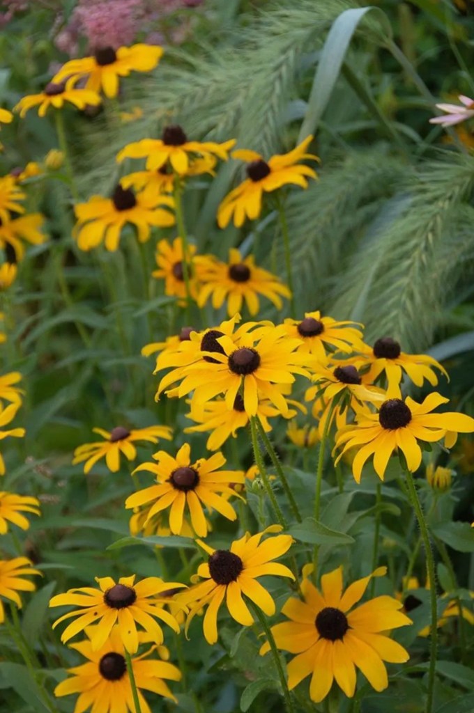 Also known as orange coneflower, this Rudbeckia has a modest height of 2-3 feet. It will bloom from July to October. It adapts to clay soil, moist soils and some drought but prefers good air circulation. It’s a slow rhizomous spreader and a prolific bloomer. Though I have grown other varieties of Rudbeckia, this plant is new to me. I have planted two next to each other and will probably wish that I had purchased more.