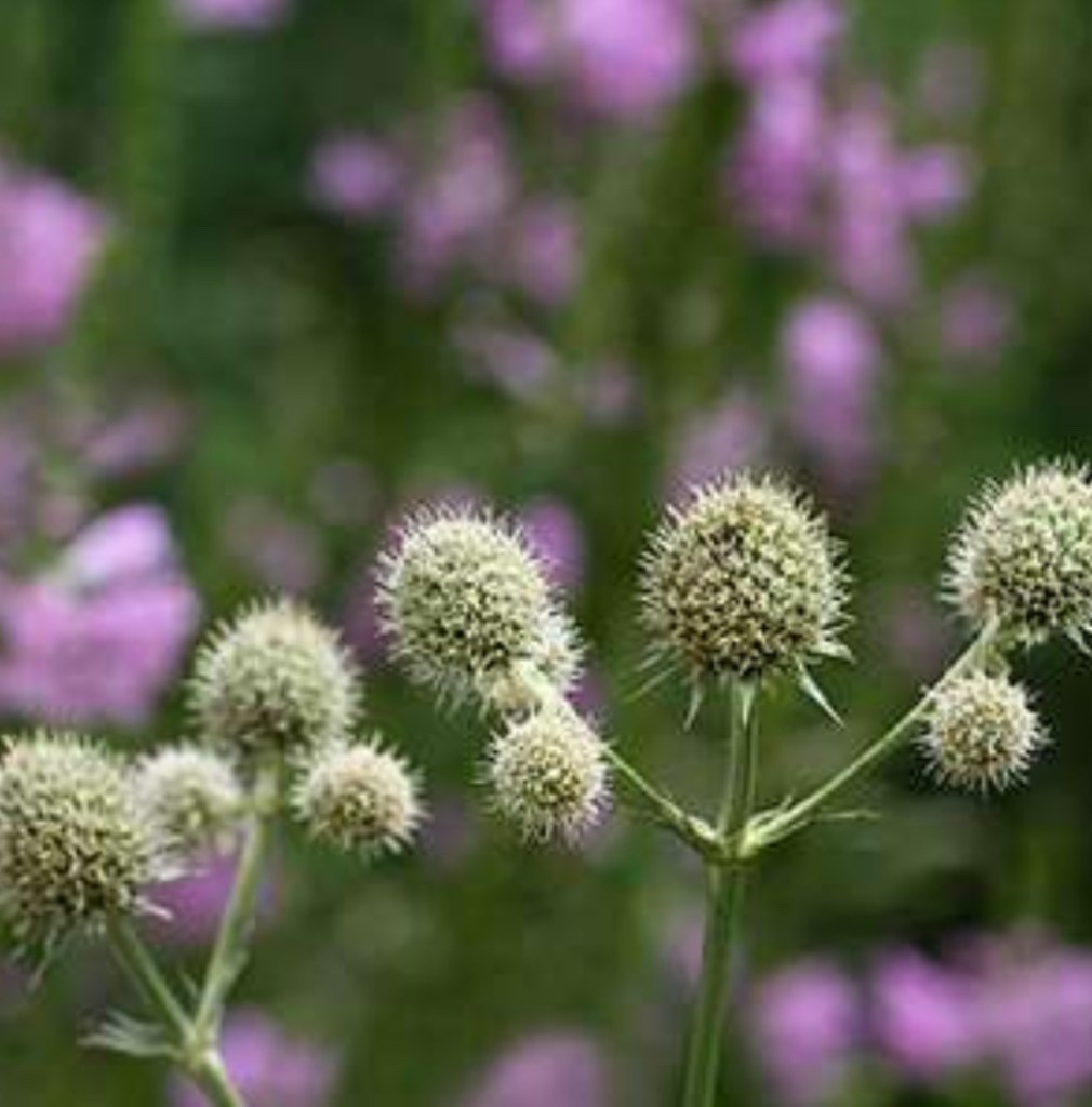 Commonly known as rattlesnake master, this native US, herbaceous perennial is a member of the Apiaceae (carrot) family. It can grow up to five feet high and 2-3 feet wide. It’s leaves resemble a yucca plant and have a thorny edge to them. What is most striking are its unusual flowerheads that appear like spiky white balls on long stems above the base foliage. It should be an eye catcher if it does well in its placement in C2. It’s the kind of perennial that I wouldn’t be able to grow for long if I were to plant a small tree.