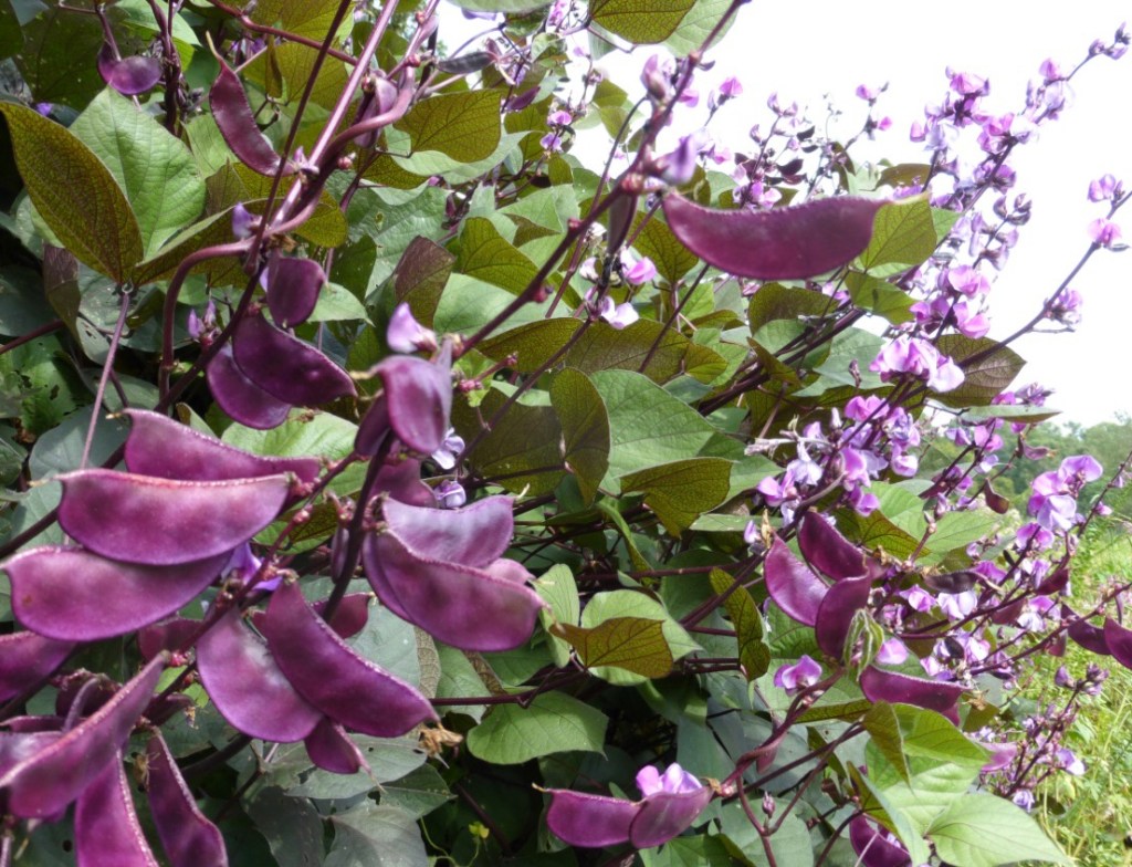 Purple hyacinth bean as it is commonly known, is non-native twining vine that originates from Africa, Asia and the Caribbean. The seeds that I purchased have been been grown in this country since at least 1802 and are the same variety grown at Monticello, Thomas Jefferson’s homestead in Virginia. It is treated as an ornamental vine here with deep purple-green stems, pretty pink flowers and 3 inch purple pea pods. According to Southern Exposure Seed Exchange, the tender leaves, flowers and pods are edible.