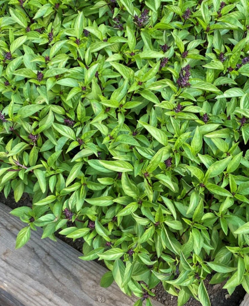 Queenette True Thai Basil is a tropical looking, exotic flavored basil that is ‘new to me’. I’ve grown herbs. I’ve grown basil but this exact variety is a new one that I happened upon on a gardener’s blog. She scattered seeds along with zinnias to fill in some spots in her perennial garden bed. It looked fantastic! The thought of also filling in space with an edible appeals to me also. The foliage is compact growing no more than 1 1/2 feet high by 1 foot wide with green leaves on purple stems and sprouting lovely violet flowers that I’m sure will draw in the pollinators. I directly seeded these into my plot, I just hope I didn’t do it too soon as we have had a few nights dip below 50 degrees F, it is April after all.