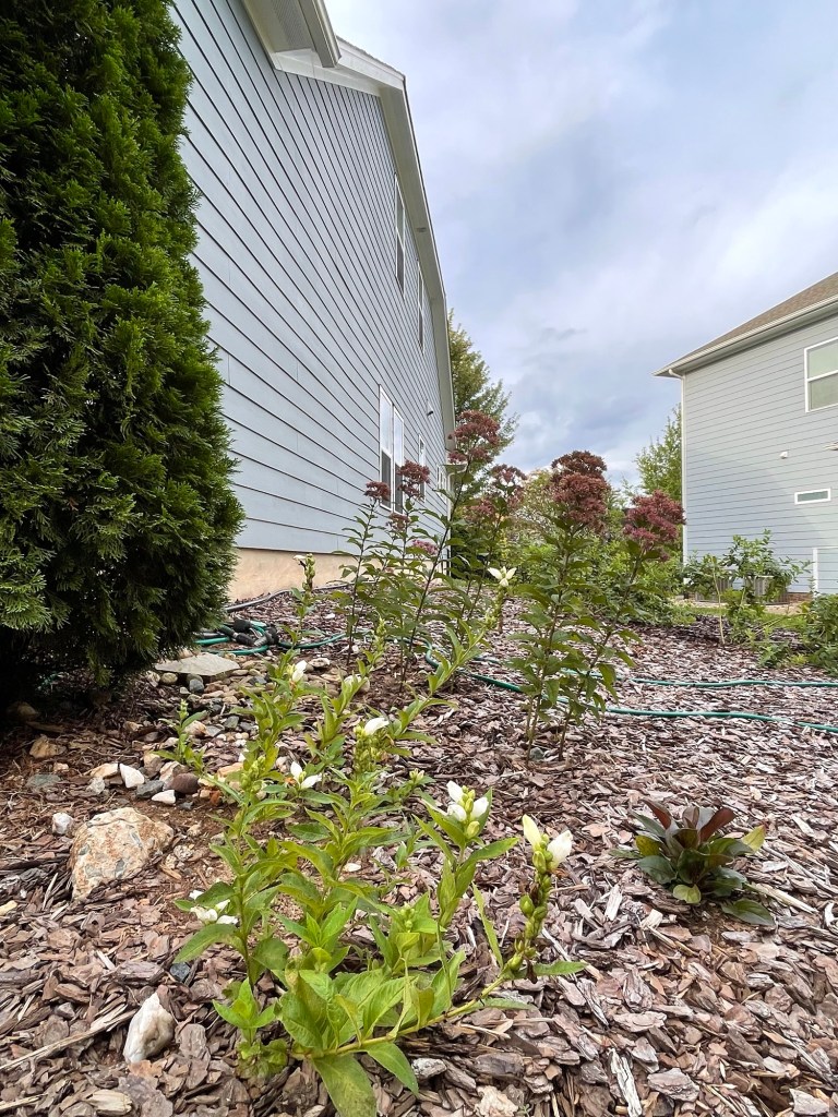 These are going to provide the main structure. I decided not to use any traditional looking evergreen shrubs. I decided against even a small tree because I wanted to allow as much light as possible. I also didn’t plant right up against the foundation of our house. I left this available as part walk way and may eventually fill in with some carex or sedge to line the walkway. This area also gets the least amount of sun.