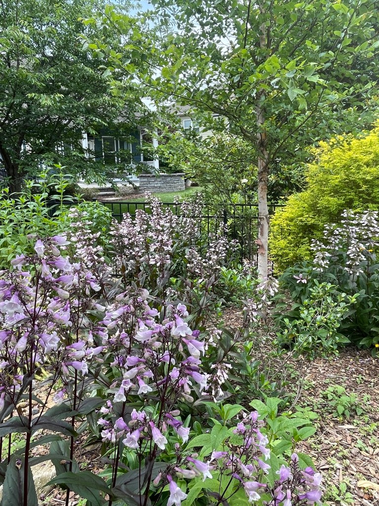 A long time favorite, native cultivar growing in my garden, ‘Husker Red’ is a solid, reliable and beautiful semi- evergreen perennial. It is a late spring bloomer with white, pink flowers on tall burgundy stems. The leaves, both burgundy in spring and deep green as it matures ,add rich color that contrasts nicely with other green foliage. It re-seeds itself slowly and I was able to dig up and transplant several of these plantlets to C2. To note: C2 is a new bed but it also connects into an established bed that runs across the front of our home (A2). Penstemon was the perennial that I chose to join the two beds as they now overlap from A2 to C2, or the front of the house to the side.