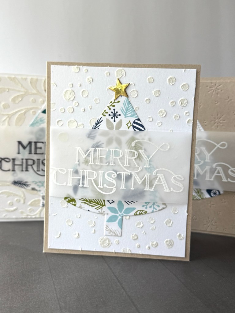 The sentiments are from Simon Says Stamp’s Making Spirits Bright stamp set and were stamped in C9’s Mushroom, which has become a preference of mine as it offers a neutral, softer tone than black. The neutral card stock is Neenah Desert Storm. For the card below I cut the turnabout stamp into a tree from C9’s All the Merry die set. The ‘Merry Christmas’ sentiment is a left over from last year’s holiday card project. It’s been heat embossed in white and is also from the Making Spirits Bright stamp and die set.