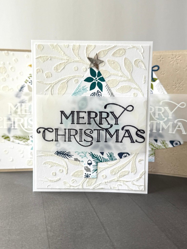 Here are two more designs using the turnabout as background while still simplifying the sentiment. In this case a bold and boxy ‘Merry’ stamped on a die cut tag, both from the C9 All the Merrys Dies and Stamp Set. Extra paper layers were added: one embossed in the foreground and one solid green behind the background.