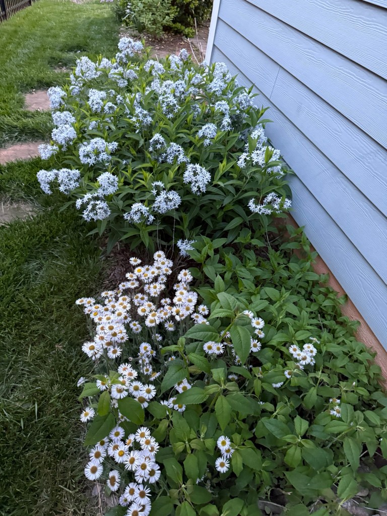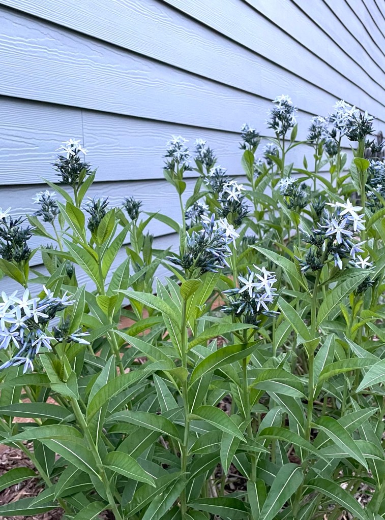 Blue Stars, Amsonia tabernaemontana, according to NC State Extension Gardener Plant Toolbox, are said to like to be planted in moist to occasionally wet soils as it is found in typically moist soils in its native areas. I have found that my blue stars have happily tolerated very dry soils for several years now without hindering its growth and bloom. It is hearty, reliable, and long blooming. And if it loves to be wet too, another bonus!