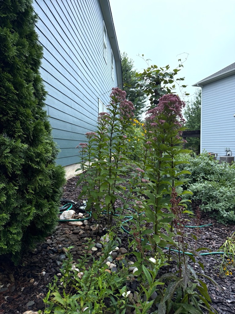 I have never grown swamp milkweed before. Hopefully I will have more success with this plant than I’ve had with Asclepius tuberosa. Hopefully there is enough sun! Hopefully it provides the needed food for the Monarch caterpillar! I think the pink blooms will look vibrant and fantastic next summer. They will add much needed color around this evergreen that dominates the corner.