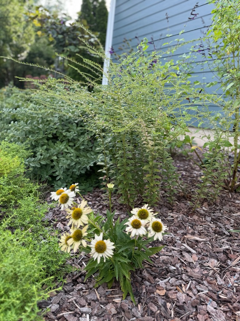 What a difference! This is the first time I’m seeing ‘Fireworks’ grow to its full shape and height! Now as we come into September I eagerly await the opening of its lengthy blooms that shoot from the top of its bushy shape like tendrils of fireworks ready to explode! These tendrils almost look as if they are on a different plant they are in such contrast from the overall shape of this goldenrod.