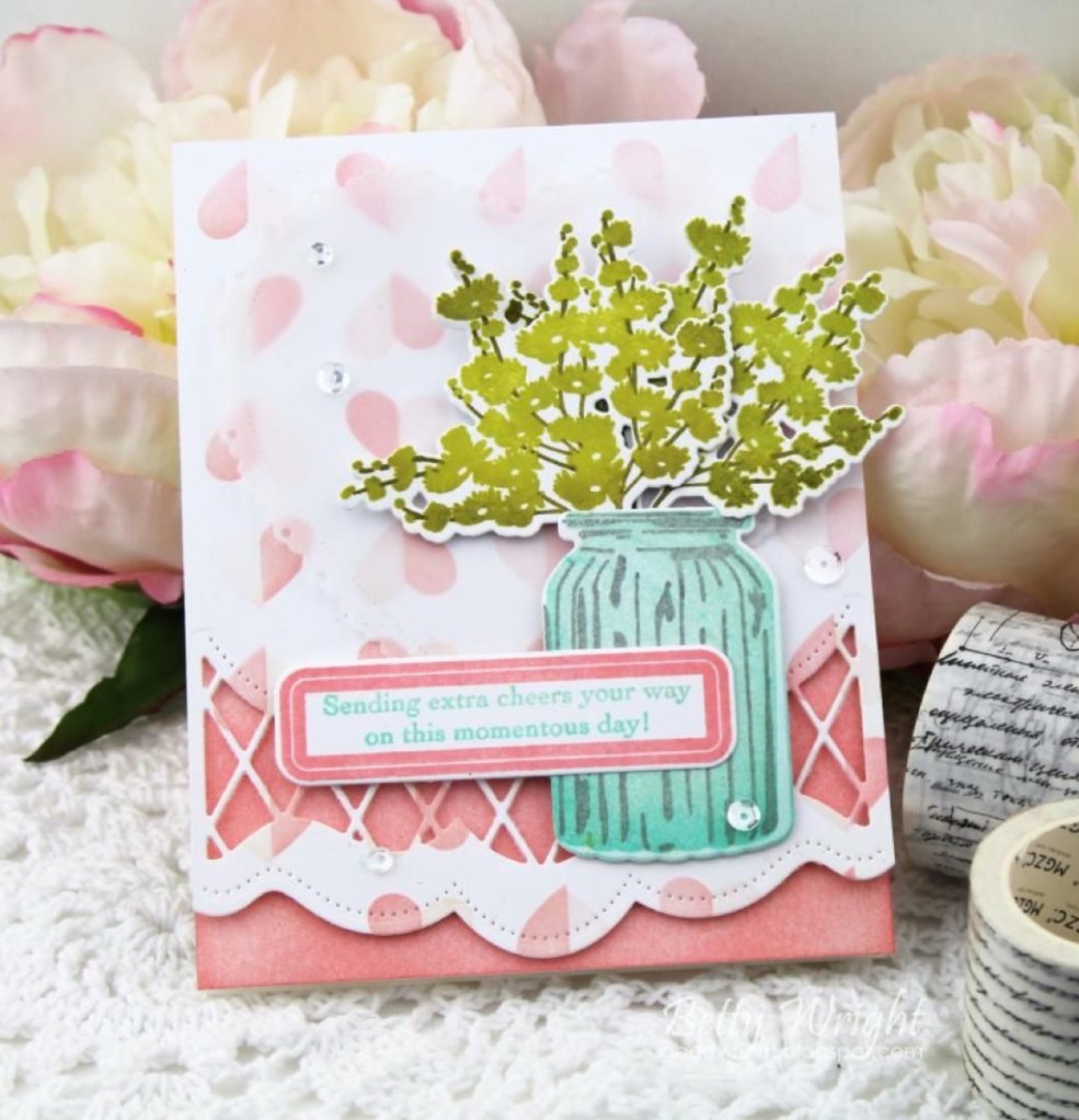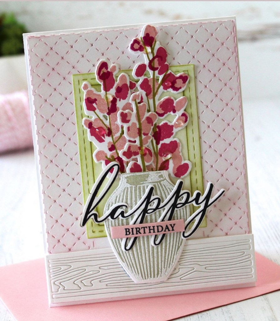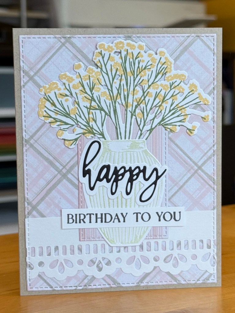 With such stellar inspiration I knew I could find elements hiding away in my craft bins that I could use to get a similar look. At first look, I loved the bright yellow foliage and springtime colors. They used patterned paper for the backgrounds. One has a decorative scalloped edge. They all use a vase stamp and die from Papertrey Ink’s Vase Collection which I have featured before here.