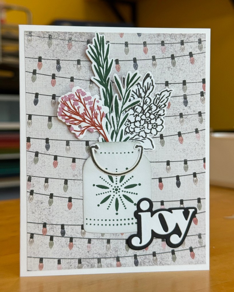 Lastly I added an already pre-cut ‘Joy’ from C9’s Holiday Sayings Die set. It seemed to fit the corner perfectly with the vase as centerpiece and standing out from the simply designed background without being too bold itself.