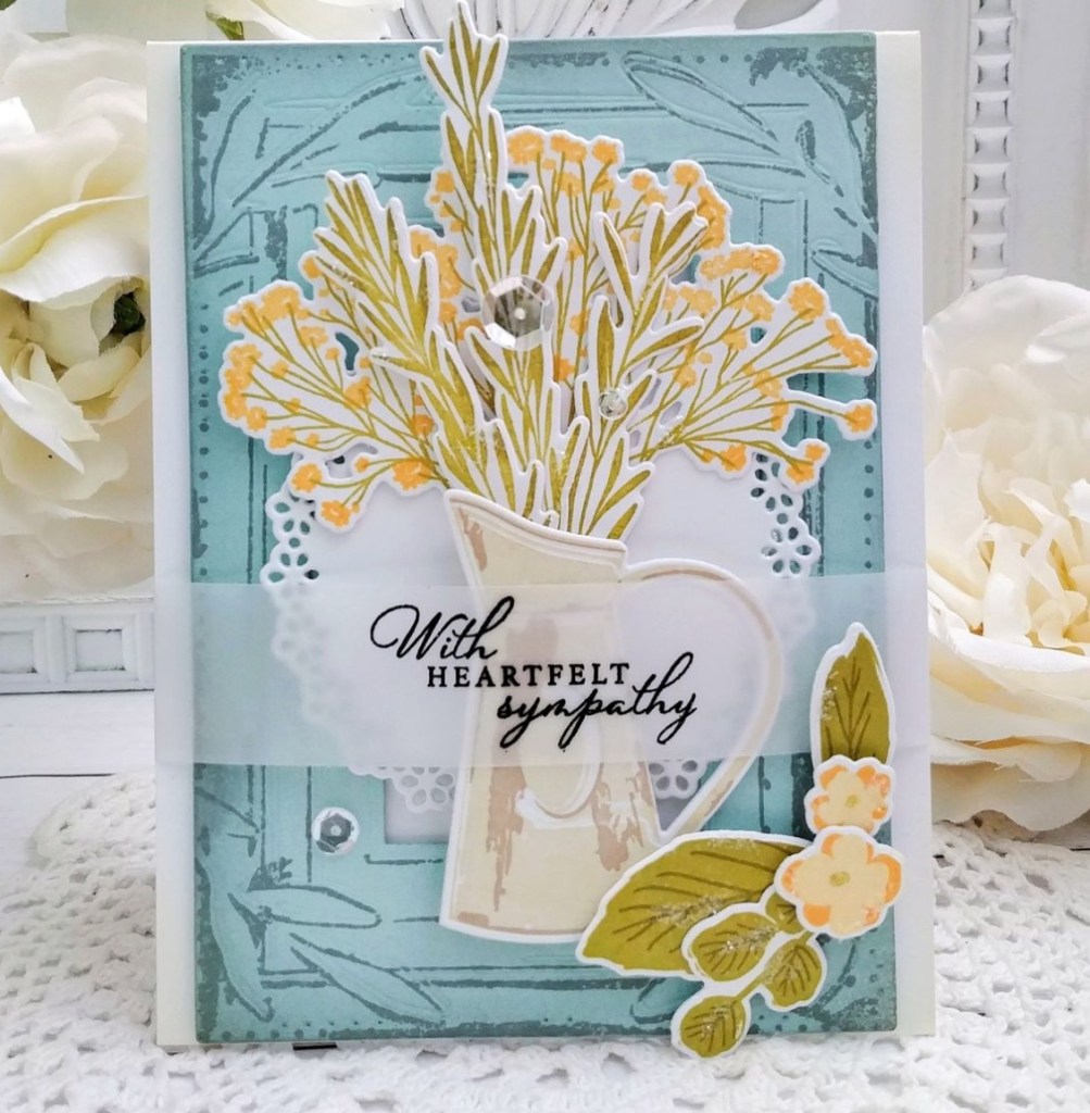 For these cards I used the vase stamps and die from Vase Collection 1. The flowers added to the vase are from Papertrey Ink’s Sprigs and Sprays Stamp and Die Set. The decorative edge is from Catherine Pooler’s Bordering Sweet Border Dies: Celebrate Friends Collection Decorative Edge that was gifted to me from their company when I placed a nice order of inks and ink refills. These elements were then all added to Neenah Desert Storm card bases for an organic look.