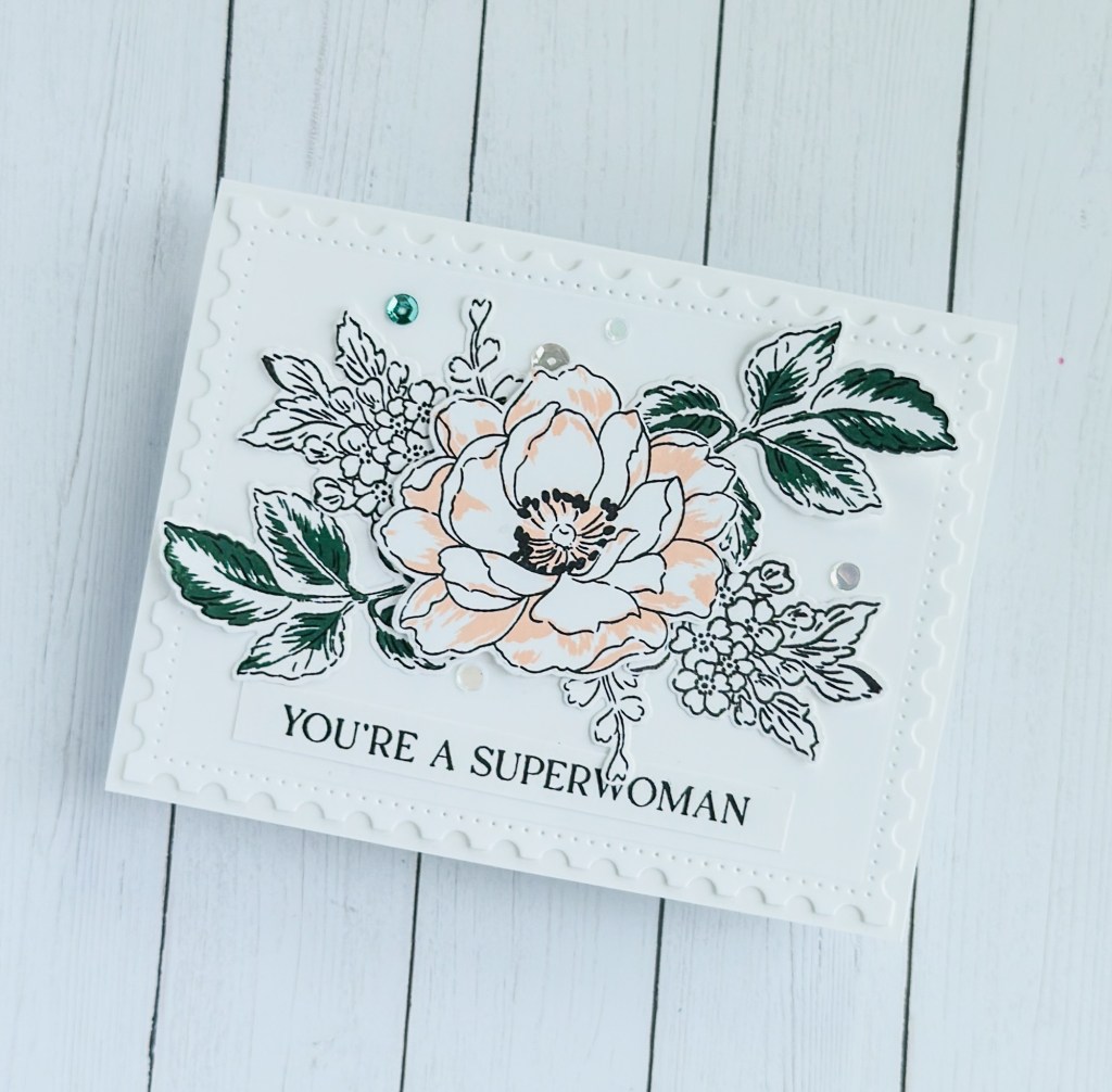 For the botanical arrangement I used die cuts from Papertrey Ink’s Into the Blooms: Christmas Sprigs and also stamped die cuts from Altenew’s Beautiful Day, which is a set used in every card of this post. There may be some other die sets used here. I just wanted to use up some of what I already had! I couldn’t help adding a little bit of black accents on this one too!