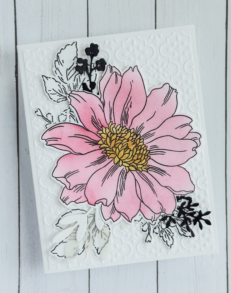 In the following card I used some miscellaneous die cut ‘scraps’ that I had saved from other projects and project attempts. In the center though is a large, beautiful, die cut flower from Altenew’s Sunshine Flowers: Stamps, Dies, Stencils and Embossing Folder Set (Project Kit). The stamped flower petals were inked with Concord & 9th’s Pink Lemonade (I think) and the center with C9’s Stardust and Gink K’s Sweet Corn.