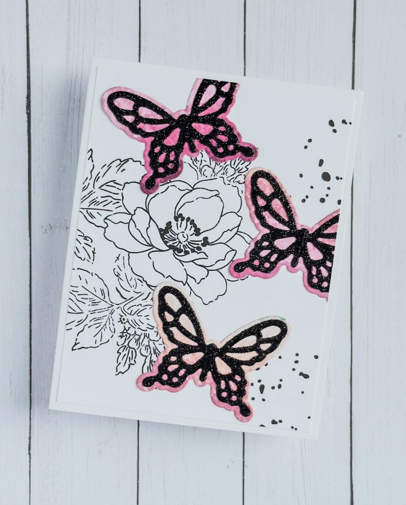 Each of these cards shows off some black and pink or black and pink-ish combinations. In using layered die cut designs (like the butterflies) or layering several dies together (like the foliage), you can add dimension and interest to your cards.