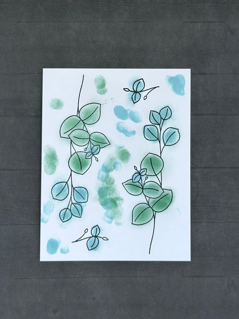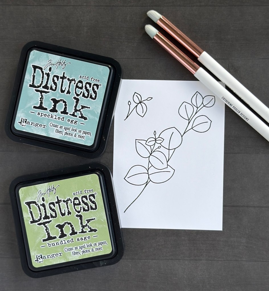 I began making another version of this card by stamping the eucalyptus stem in Versafine Onyx Ink which is my black ink of choice for outline stamps. This is pigment ink so give it a moment to dry before you work with it, but for a pigment ink it dries quite quickly. I selected my inks and used Bundled Sage and Speckled Egg again for one set of sprigs. For the other I decided to use C9’s Eucalyptus and Powder. I used finer tip blending brushes like the ones from Catherine Pooler Designs as seen in the photo. I also made sure to dab off ink before I worked brush onto stamped design so ink wasn’t too heavy or with obvious brush strokes.