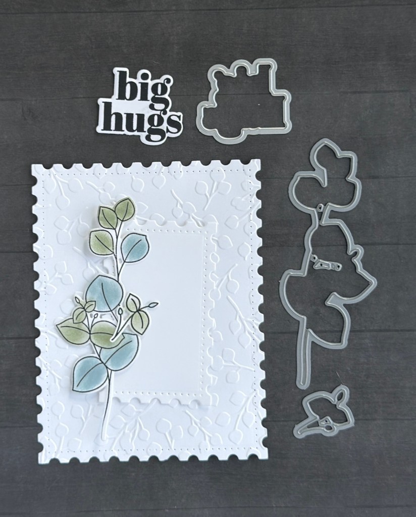 With the modified card layout I also took the opportunity to change up the sentiment. My new cards use a ‘Big Hugs’ stamped sentiment and shadow background die from Altenew’s Beautiful Day: Layering Stamps and Dies Set. The sentiment nestles into the lower corner just overlapping the inner frame. I also used two different embossing folders: Paper Rose’s Baby Blue and SSS’s Vine Canopy.