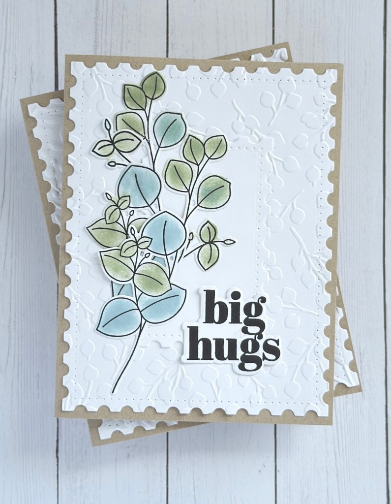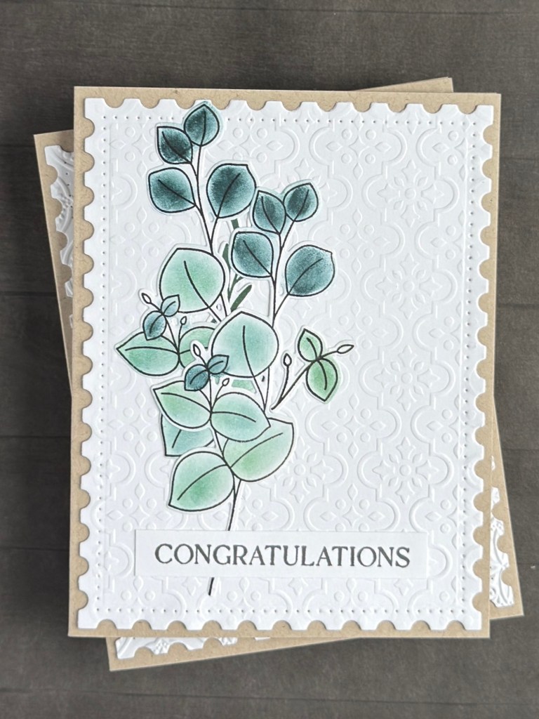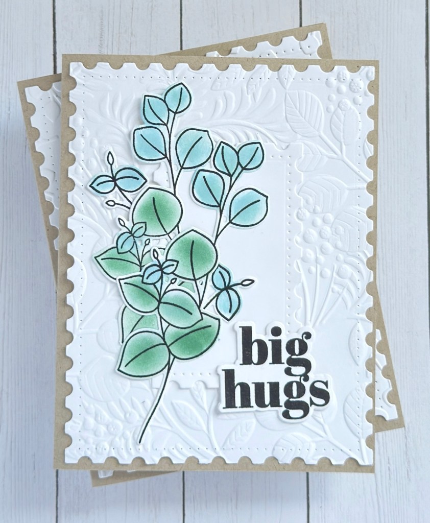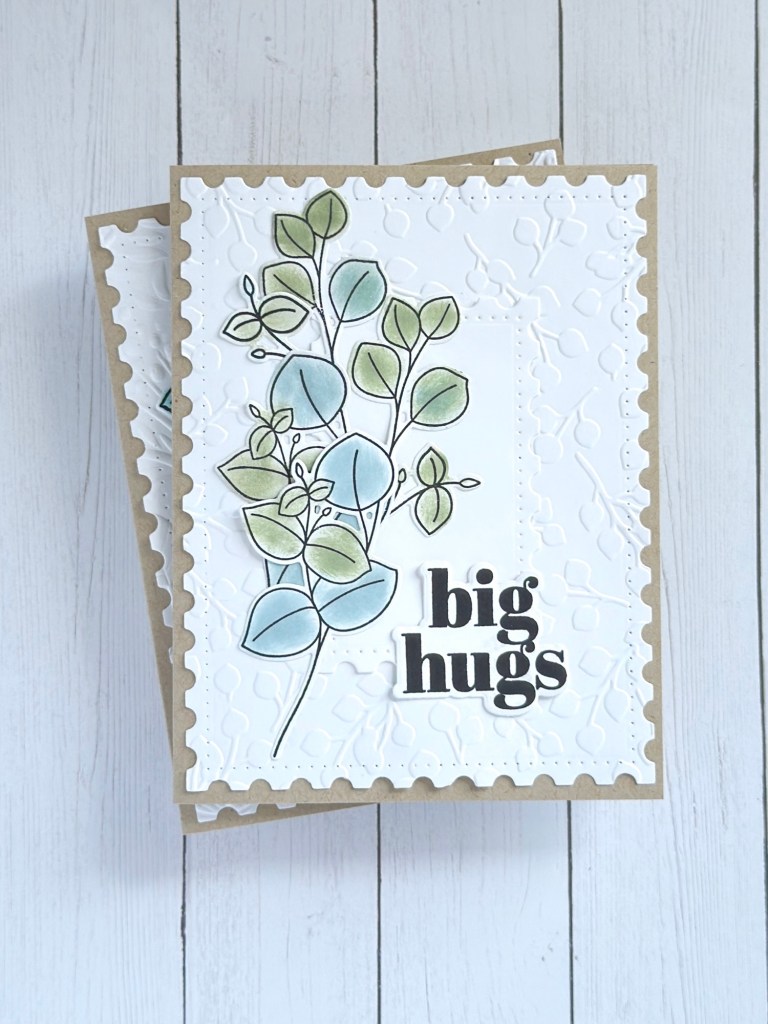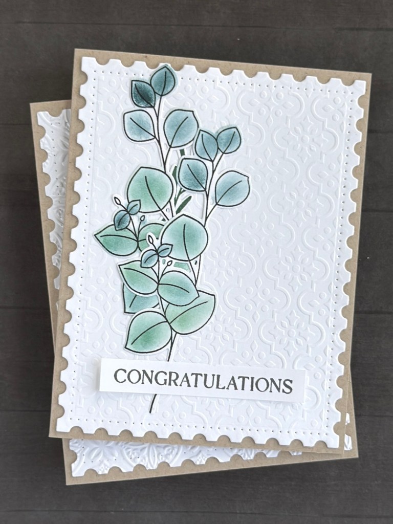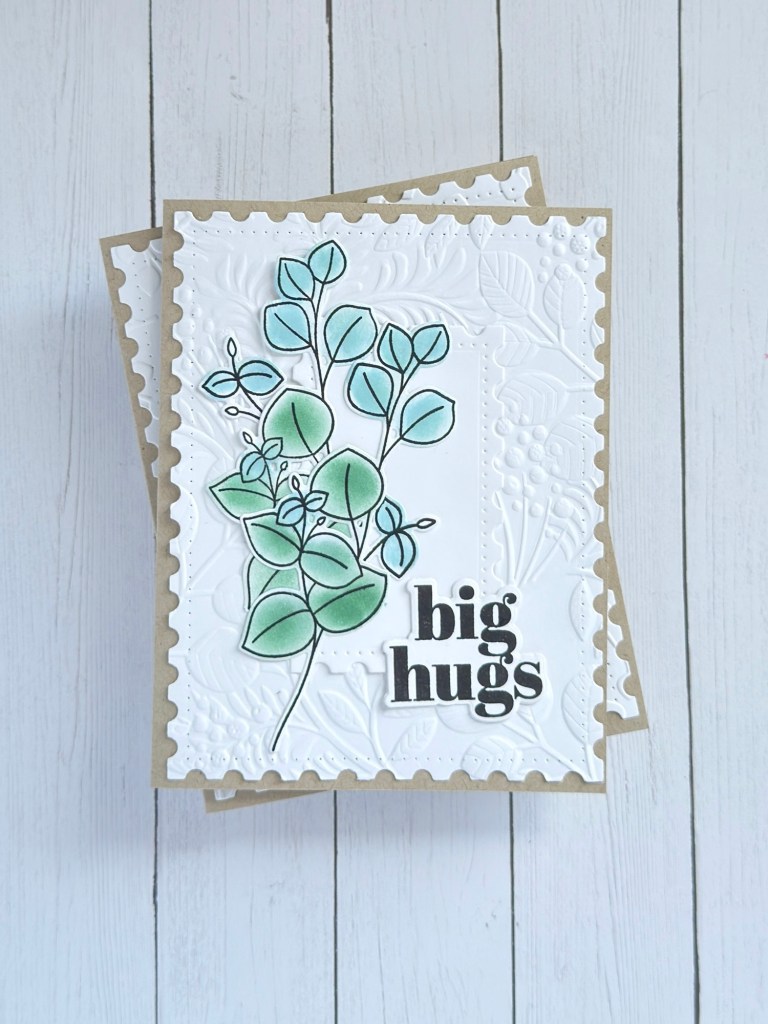 Though I love to see the beautiful embossing patterns having a chance to stand out in this inspiration design, I may just prefer the look of adding another postage edge layer. Widening up the foliage placement also filled the overall card space better, as did adding an extra tiny leaf to the two stems and one little leaf used in the inspiration cards.